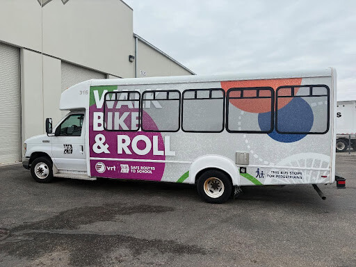 The bus has a new wrap in partnership with the Office of Highway Safety SHIFT Program. The inside has been reconfigured to hang 12 bikes on one side to create floor space. Treasure Valley SRTS is collecting stickers from every school served and they are displayed on the bumper.
